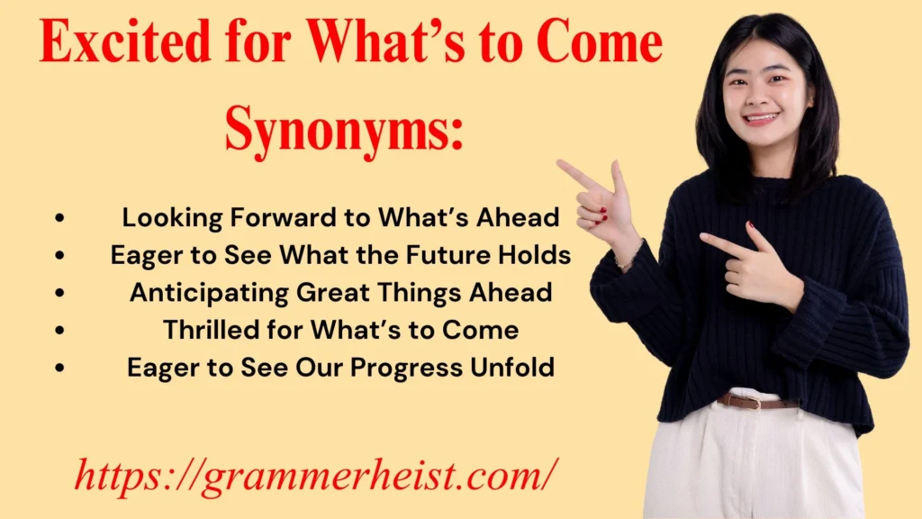 These 30 alternatives to “Excited for What’s to Come” offer a variety of professional ways to communicate eagerness and anticipation. Use them thoughtfully to connect with others, set the tone for productive discussions, and express a forward-thinking mindset.