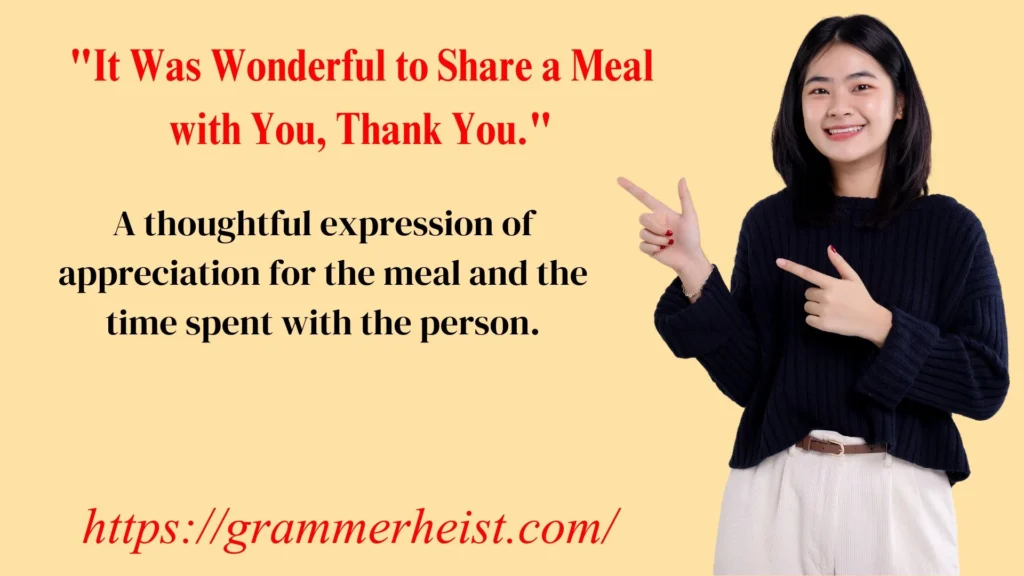 Scenario Example: After a lunch meeting, you might say, “Thank you for the wonderful lunch! It was a great choice, and I truly enjoyed our conversation.”